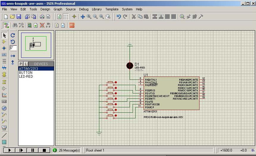 ;Алгоритм сканирования кнопок на одном порте.Нажимая кнопки будет загораться светодиод.