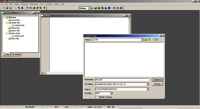Шаг 9. Нажимаем File\New откроется новое окно с названием "Untitled", даем новое имя и расширение File\Save as... сохраням в той же папке как NEW.ASM.