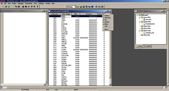 Шаг 12. На любом окне можно щелкнуть правой клавой и чё нить добавить или убрать, например тут мы добавили формат отображения данных в регистрах - двоичный и десятичный.