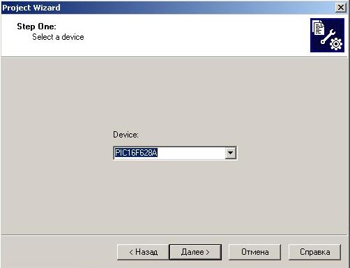 Шаг 3. Нужно выбрать в выподающем списке "Device:" с каким усторйством будем работать. В нашем случае это PIC16F628a.