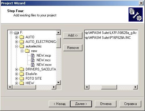 Шаг 6. Находим папку где установлена MPLAB, например, у меня установлена в C:\Program Files\Microchip\MPASM Suite\p16f628a.inc, выделяем файл p16f628a.inc и нажимаем "Add". Нажимаем "Далее".